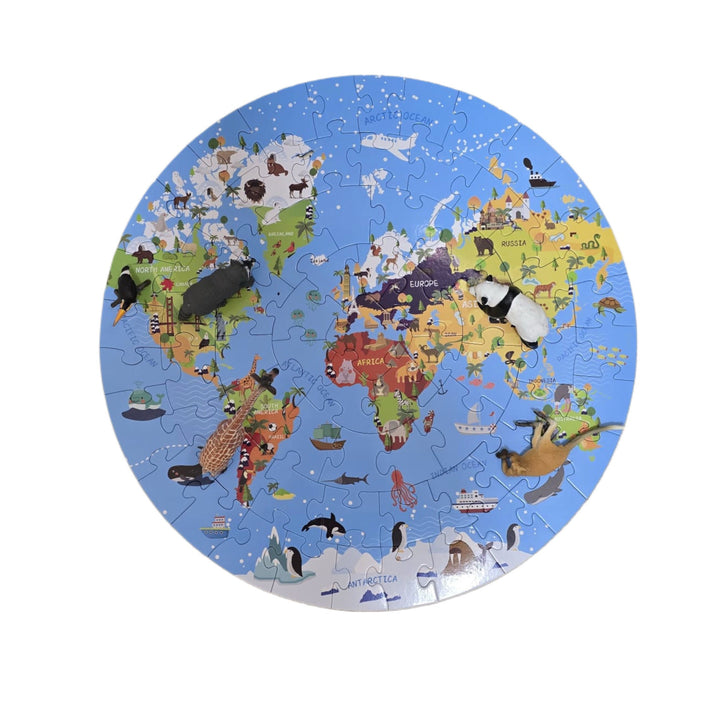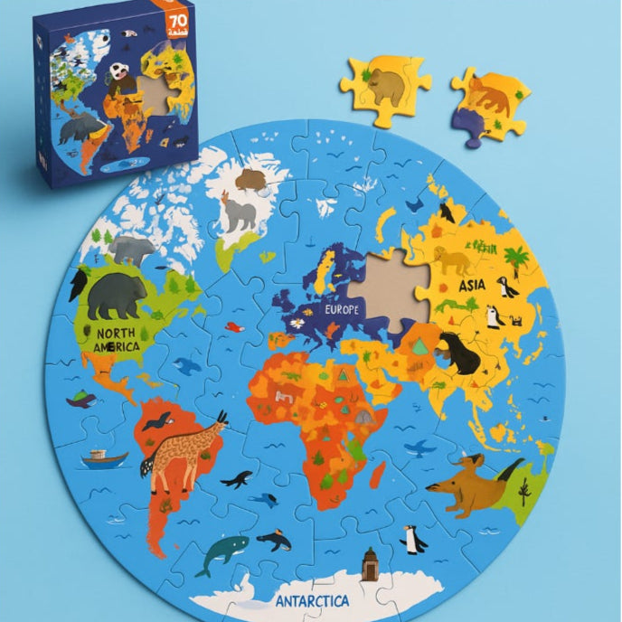 هذا البازل الدائري المكوّن من 70 قطعة يعرّف الأطفال على القارات، الحيوانات، والمحيطات بأسلوب بصري جذاب وتفاعلي.