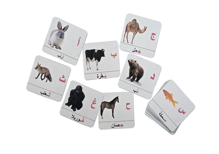 تحتوي المجموعة على بطاقات لكل حرف من حروف الهجاء العربية، بتصميم واضح وجذاب يُسهم في التعرف البصري على الحروف.