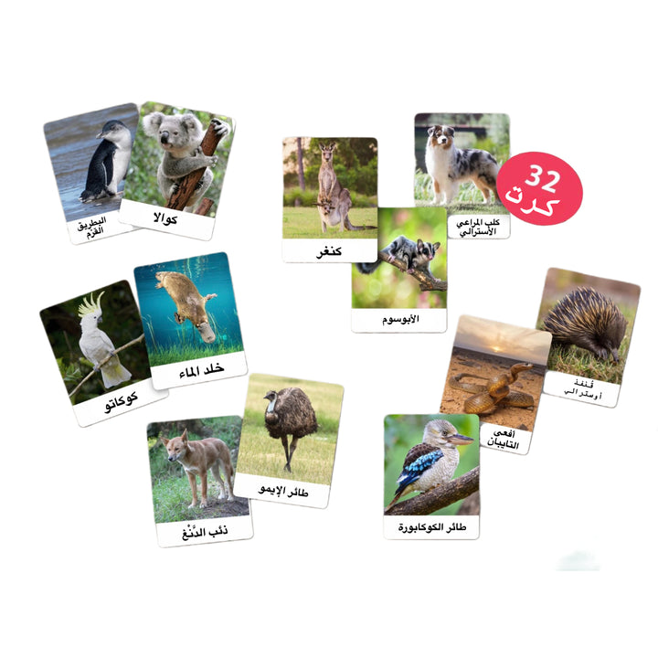 🦘 بطاقات مصممة برسومات جذابة وواضحة، ومطبوعة على ورق مقوّى عالي الجودة وآمن للأطفال.