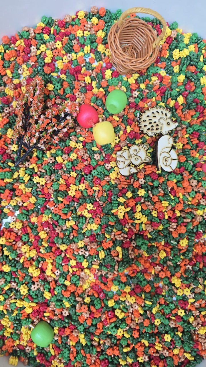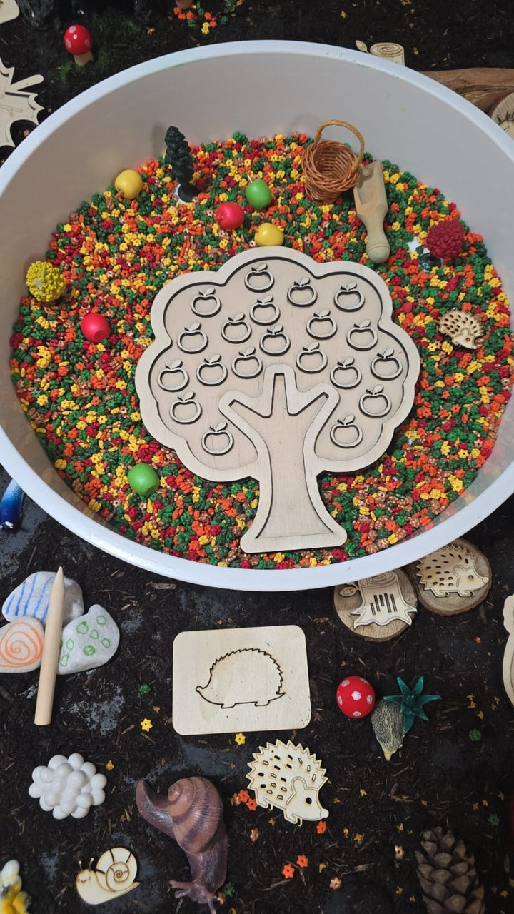 هذا الخليط الملون والمبهج يجمع بين حبوب حسيّة بألوان الخريف، شخصيات غابية خشبية مثل القنفذ 🦔 والحلزون 🐌 والسنجاب 🐿️، إضافةً إلى تفاحات خشبية وسلّة صغيرة للّعب التخيلي والتصنيف.