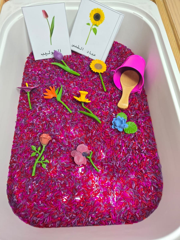 يحتوي على أرز حسي ملون بدرجات زهرية جذابة وأزهار خشبية بألوان نابضة بالحياة، مع أدوات للّعب الحسي والسكب.