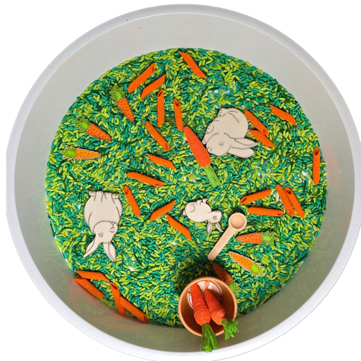اصنعي تجربة ممتعة لطفلك من خلال هذا الخليط الحسي المستوحى من عالم الأرانب والجزر! مثالي للأنشطة الحسية واللعب المفتوح وفقًا لفلسفة مونتيسوري.