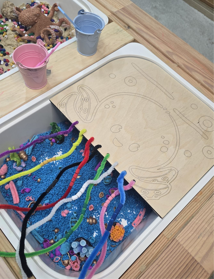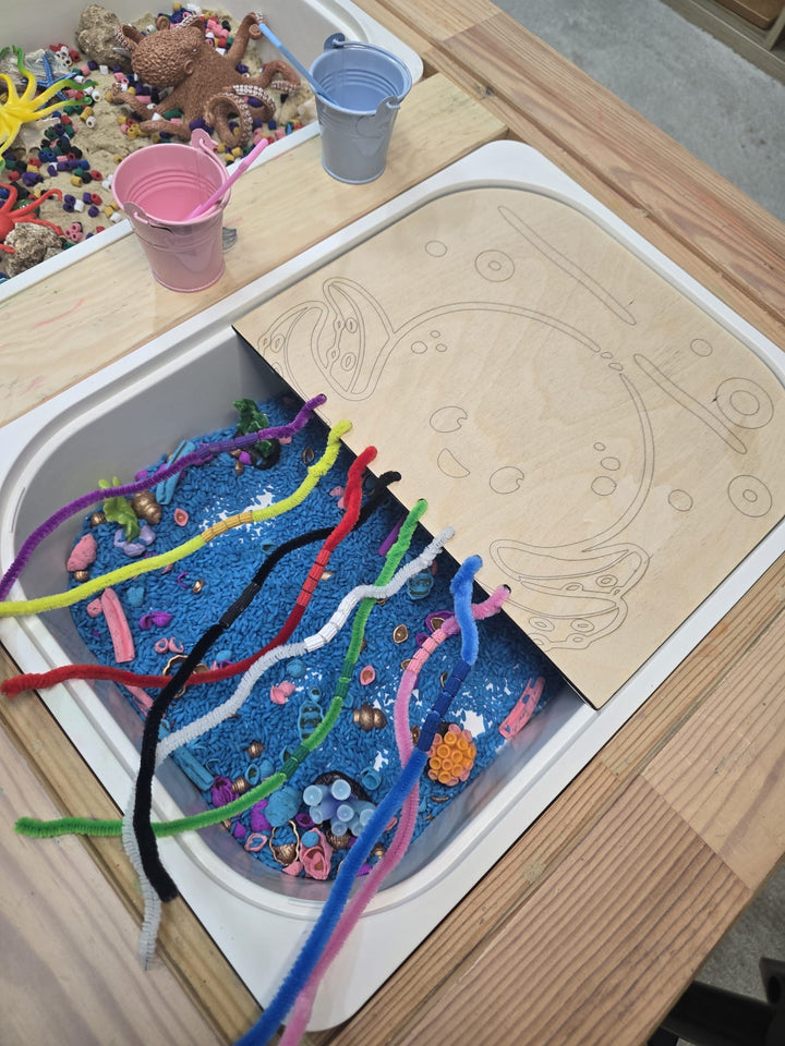 لوح خشبي على شكل أخطبوط لطيف، مزوّد بفتحات لتمرير الخيوط أو أعواد البايب (Pipe Cleaners)، مما يسمح للطفل بتزيين أذرع الأخطبوط بالألوان والخرز.