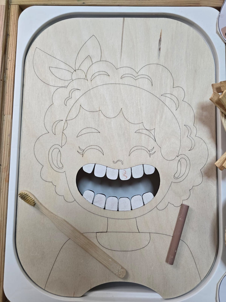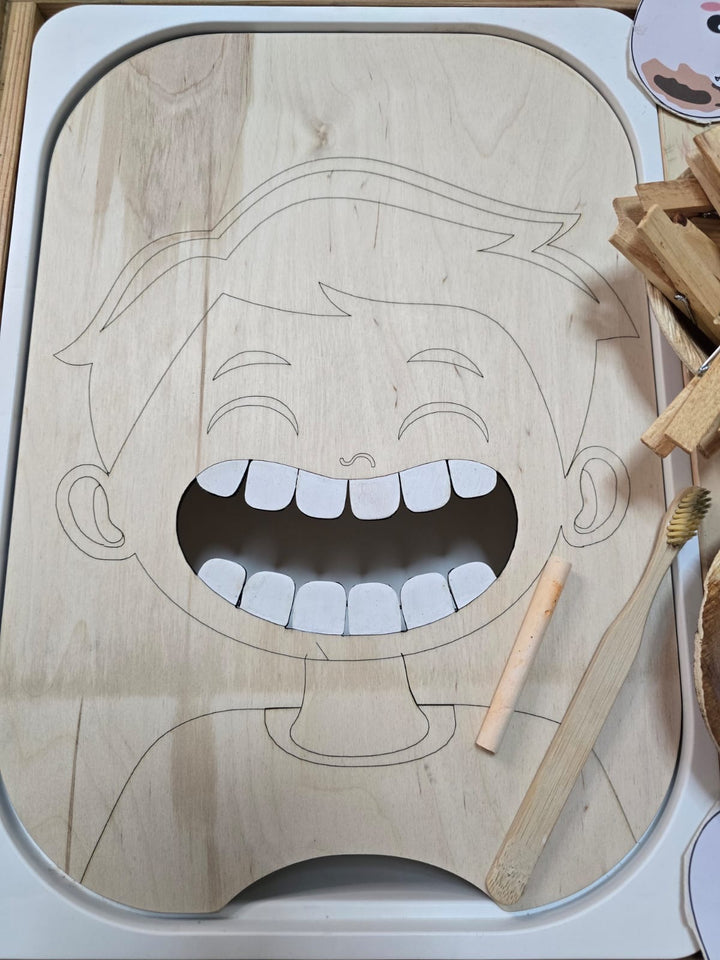 منتج تعليمي مبتكر يجعل العناية بالأسنان تجربة ممتعة وشيّقة للأطفال. من خلال هذا اللوح الخشبي المصمم بعناية، يستطيع الطفل استخدام الفرشاة لتنظيف الأسنان المرسومة، مما يحوّل فكرة العناية بالنظافة الشخصية إلى لعبة مليئة بالمرح.